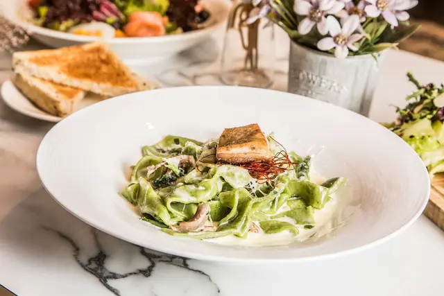 去骨的油封鴨腿肉,搭配新鮮菠菜手工寬麵, 主廚手工製作的Q彈帶勁的菠菜手工寬麵,搭配特調奶油醬汁拌炒,奶香清爽鹹甜不膩口,還能吃到麵香,麵裡也放入油封鴨腿條,鹹香味道鮮明的油封鴨為這義大利麵帶來驚喜口感