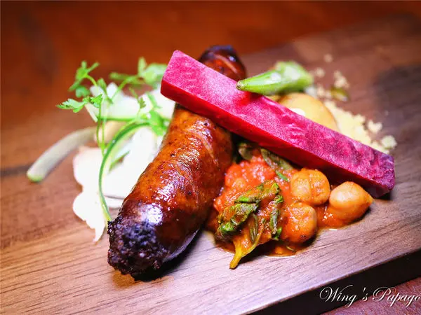 前菜的臘腸是使用西班牙辣香腸,它其實是用台灣豬肉下去做的,