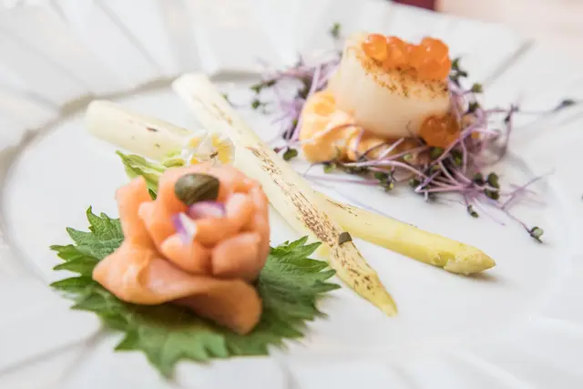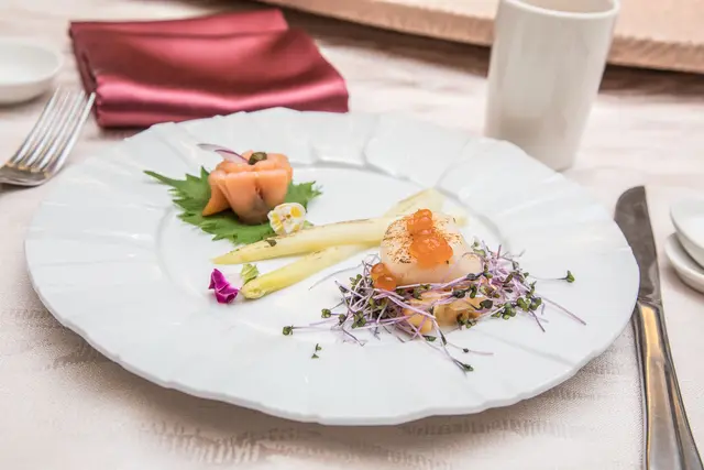 煙燻鮭魚與炙燒生食級大干貝,干貝底下還佐以奢侈的龍蝦沙拉,搭配的炭烤白蘆筍,白蘆筍只取中間幼嫩的部位炭烤,鮮嫩多汁,大干貝上面放鹹鮮鮭魚卵,海味十足,煙燻鮭魚則是搭配紫蘇,口感風味超有層次