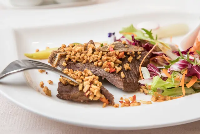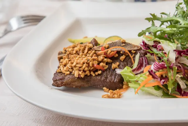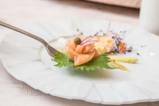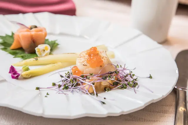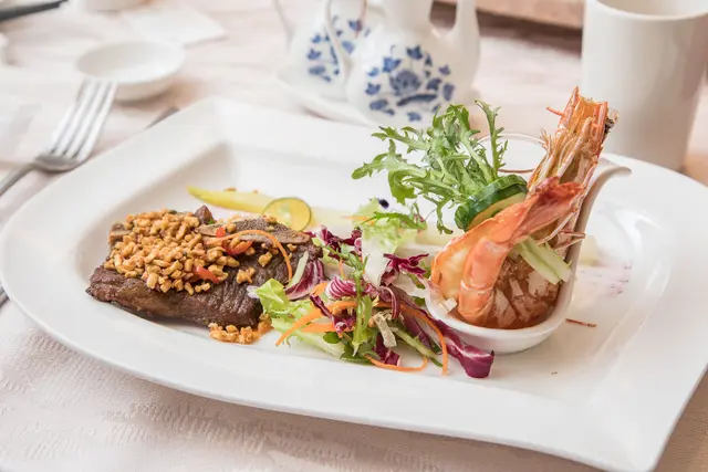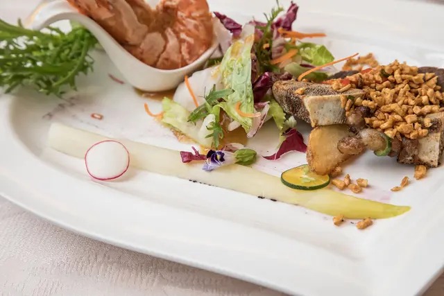 中間的沙拉則是佐酸甜的和風醬汁,也可以和明蝦跟牛小排一起食用,白蘆筍則是藏在沙拉後方,各種食材都搭配一起入口,相輔相成,美味大加分!