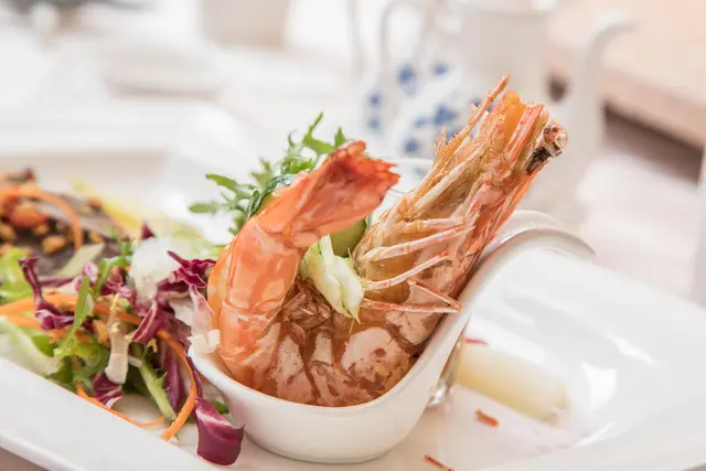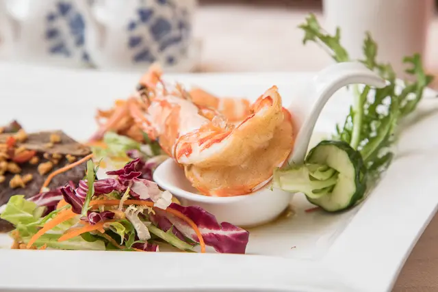 大明蝦已貼心去除腸泥,以酥炸的料理手法呈現,高溫鎖住明蝦的鮮味,且保留著明蝦Q嫩多汁的彈性口感,厲害!