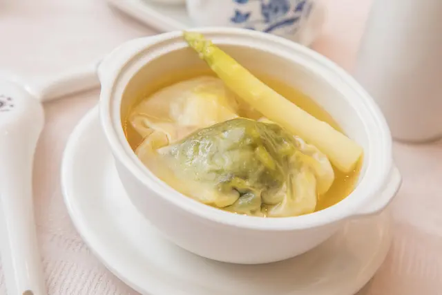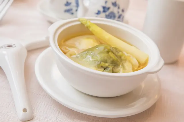 香茜蘆筍灌湯包根本經典!湯頭使用清爽的玉米雞加上白蘆筍一起熬製,湯色金黃香氣濃郁,中間擺的是特製的大湯包