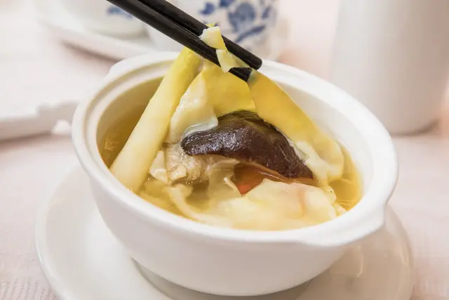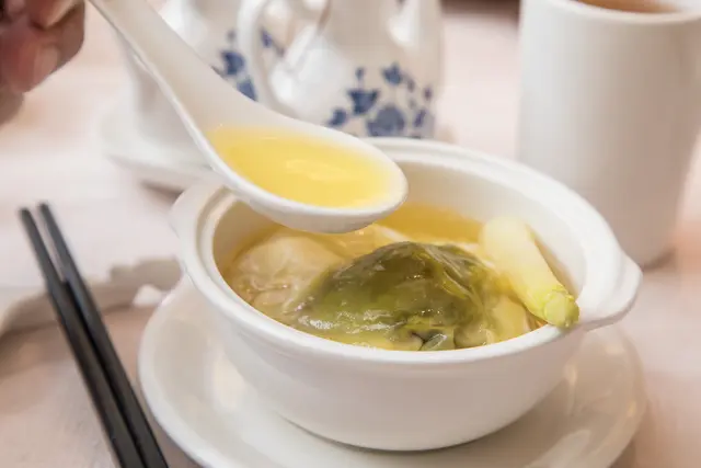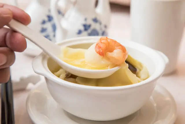 撥開薄可透光的湯包皮,湯包裡面有干貝、鮮蝦、百菇、絞肉等食材,經過白蘆筍玉米雞湯的煨煮,甘美的湯汁滲著其中,入口盡是飽滿鮮甜的高湯氣息,這雞湯超級厲害,越喝越甘甜,且未到超有深度,喝上一口就停不下來了!