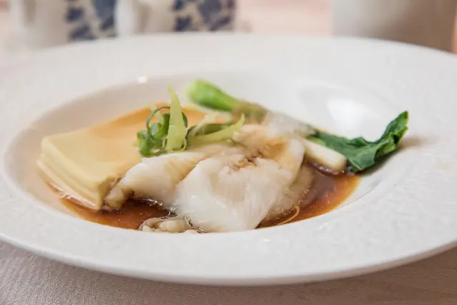 這道的白蘆筍是以竹笙跟油菜捆成一束,造型就像髮簪一樣,入口可以吃到油菜單苦甘甜味及白蘆筍的鮮嫩多汁,浸潤蒸魚的高湯,極鮮!