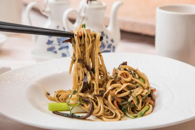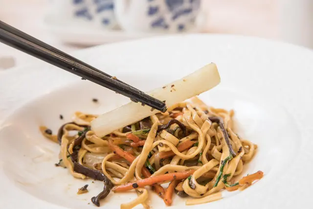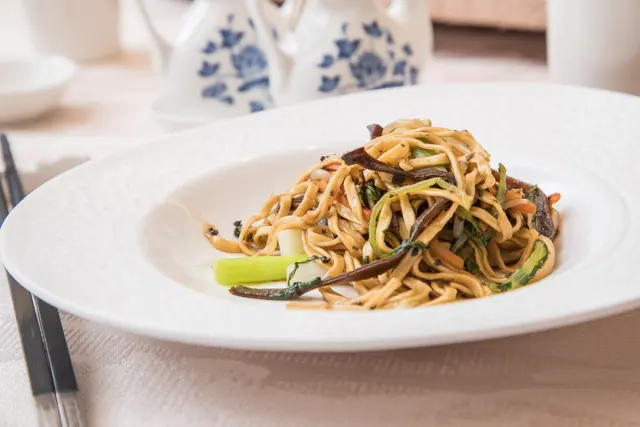 意麵以特製醬汁調味拌炒,裡面加入了爽脆的黑木耳、紅蘿蔔絲,這意麵鑊氣十足,完全炒出醬汁濃郁芬芳的味道,意麵的熟度拿捏的恰到好處,軟質帶Q又入味,底下鋪白蘆筍,鹹香柔軟的意麵更稱脫出白蘆筍的甜脆