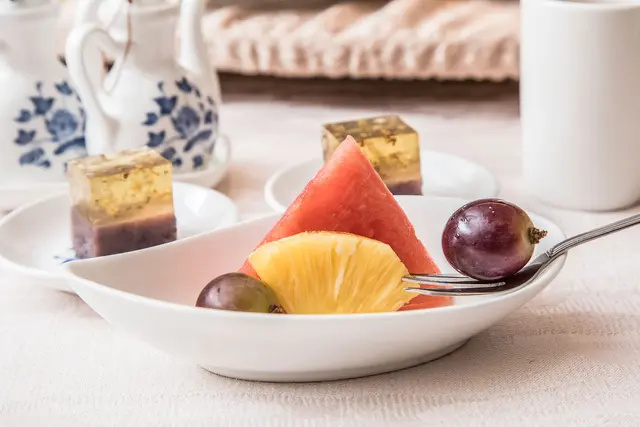 王朝中餐廳的甜點也不馬虎,典雅桂花紅豆茶凍,晶瑩剔透清雅的桂花茶凍搭配軟綿香甜的紅豆,甜而不膩很好吃,加上清爽水果,為今天的極品寶島白蘆筍饗宴畫下最完美的句點!