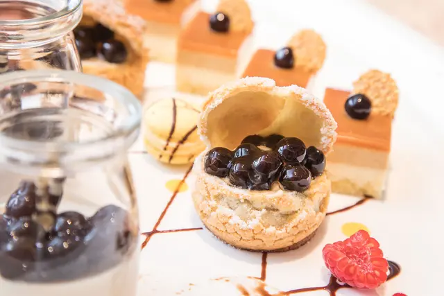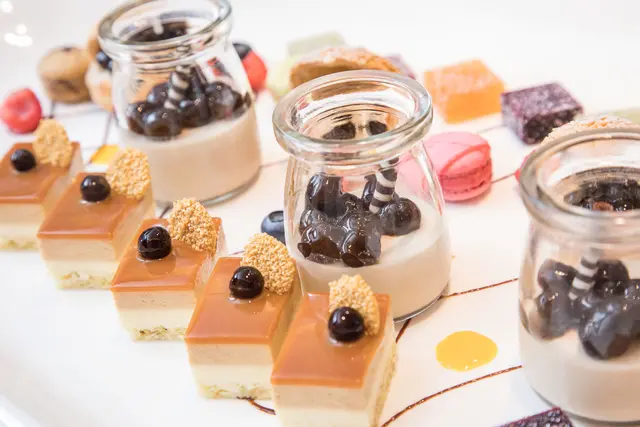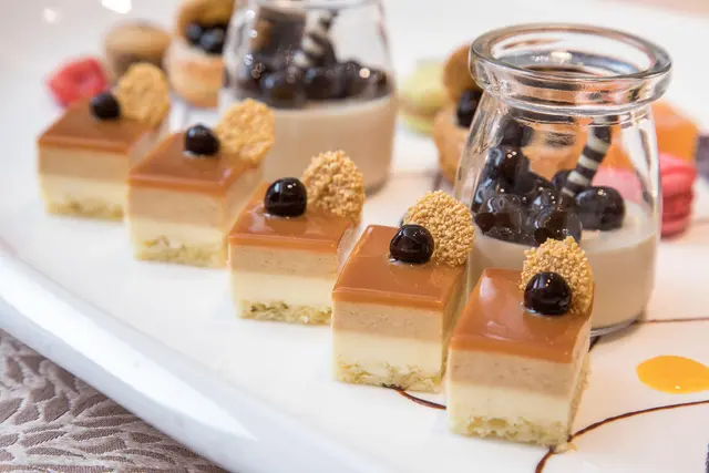 最近吹起一股黑糖珍珠風,走到哪都見到黑糖珍珠的蹤跡,凱薩飯店也沒錯過這股熱潮,以黑糖珍珠為主角設計出許多令人驚豔的精緻甜點,珍珠伯爵鮮奶酪是以輕盈的伯爵茶搭配Q彈的黑珍珠,再以巧克力捲取代吸管,兼具視覺及味覺的雙重享受,焦糖伯爵珍珠慕斯蛋糕則是以口感綿滑的戚風蛋糕夾上焦糖慕斯,入口即化,法式珍奶泡芙使用蓬鬆的法式軟泡芙皮搭配濃郁的奶茶卡士達醬,黑糖珍珠在口中跳耀,甜而不膩的口感,令人回味再三!
