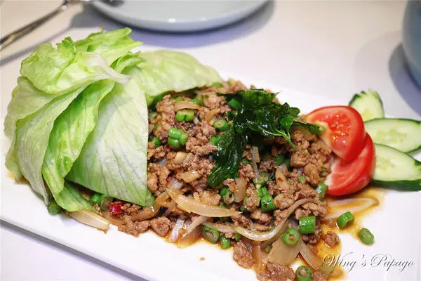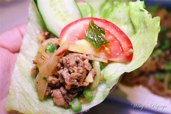 把打拋豬包在美生菜內入口,多了鮮脆的蔬菜中和味覺,