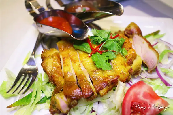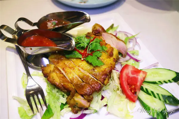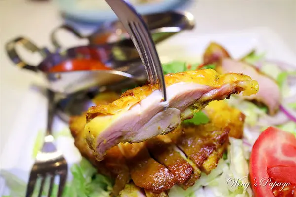 以薑黃醃製烤過的雞腿肉切塊後底下搭配生菜及洋蔥絲送上桌,