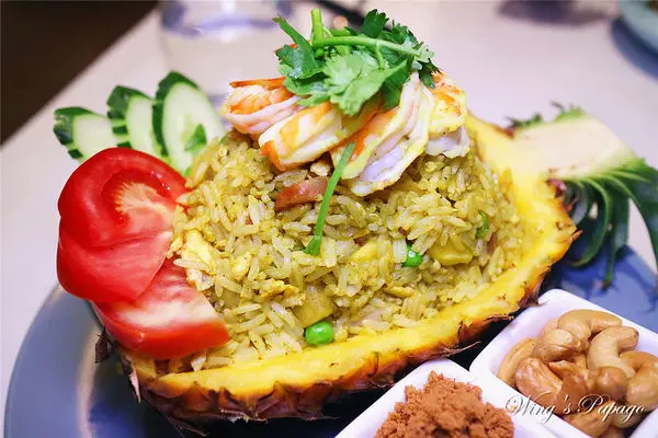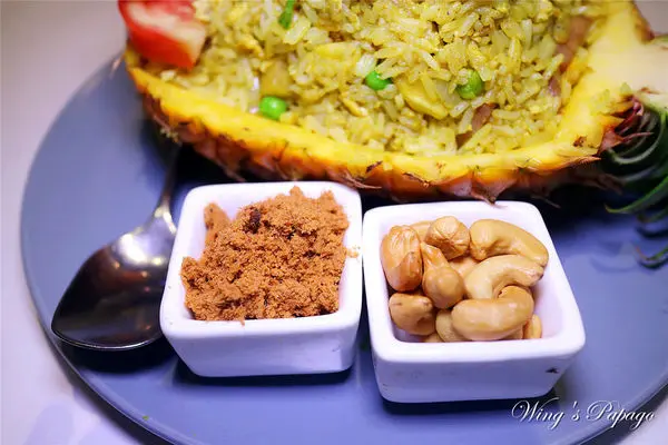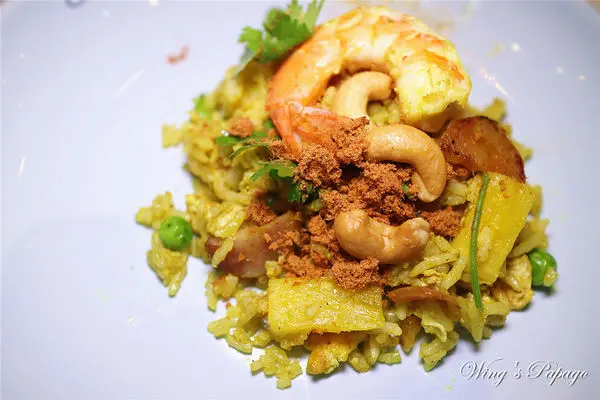 把帶有薑黃香氣的鳳梨炒飯配上酥脆腰果及肉鬆入口,