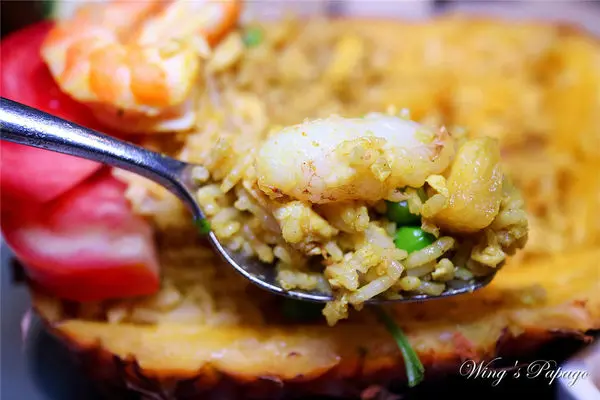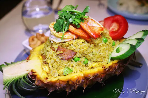 哇!這道用半顆剖半鳳梨挖空後盛裝滿滿的炒飯,