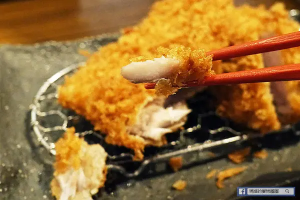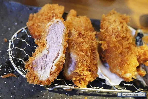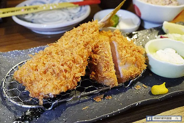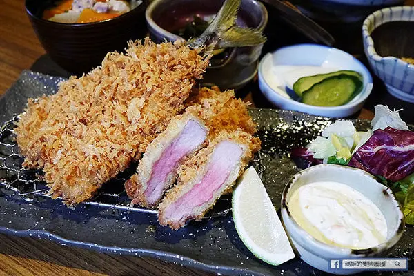 整尾去頭的竹莢魚用麵包粉緊緊的扒住,炸得黃金誘人再裝盤,而旁邊則是經過熟成後同樣包裹麵包粉油炸的腰內肉豬排,切開的斷面還清晰可見粉嫩的色澤,不過不用擔心,它吃起來完全無腥味,而且肉質在紮實的口感中不失細嫩,厚實的感覺更讓人迷戀不已。