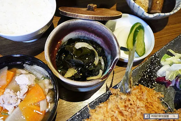 整份套餐該有的基本配備,無限續加的高麗菜絲、白飯或十穀飯擇一,還有海帶湯、味噌湯或豬肉湯可選擇,前三種都是可以吃到飽,另外搭配自製醃漬小菜和海帶,當然也少不了深煎芝麻,組合成一組套餐。