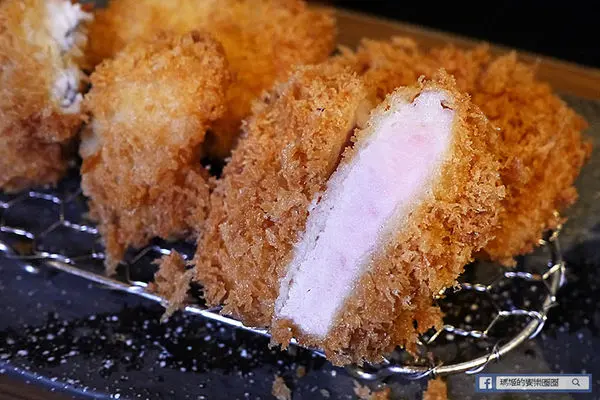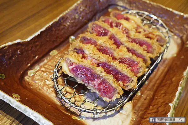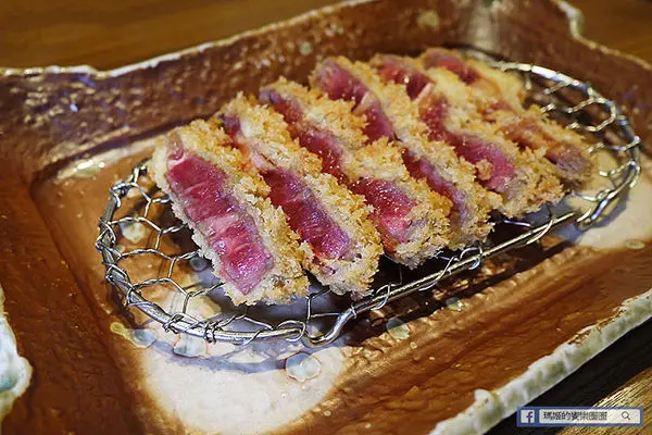 因為是肋眼部位,會有筋的部份,瘦肉的部位肉質細緻柔嫩,外層包裹香酥麵包粉,上桌呈現三分熟度,若是怕太生的朋友再利用鐵板炙燒依自己喜歡的熟度加熱再食用。