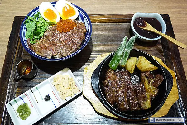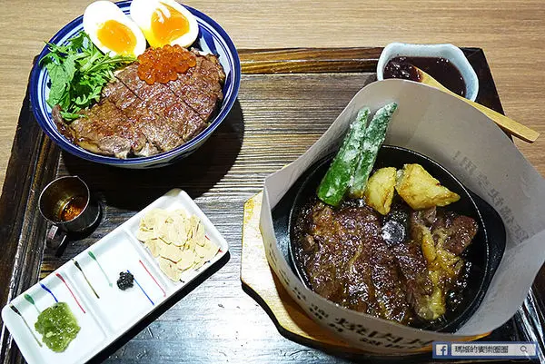 「無雙牛排丼霜降沙朗」480元,這一份有八盎司沙朗牛排,以鐵盤照燒及原味日式經典,呈現二種吃法,感覺好特別!