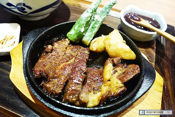 肉片在鐵盤上持續加熱,但嚐起來肉質卻不會老,旁邊還附有炸秋葵和馬鈴薯,都好吃且不油膩