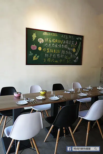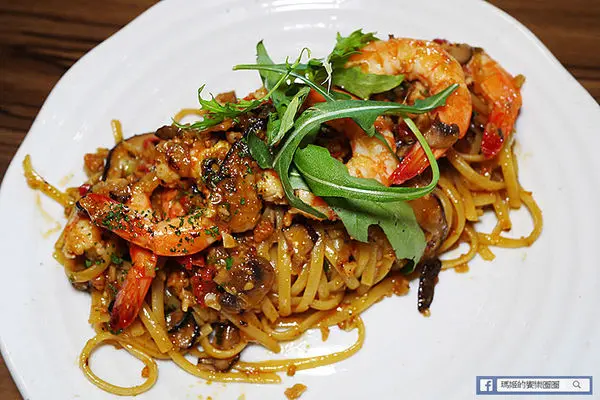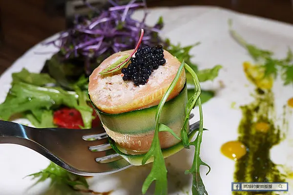 店裡以中式西式合併的創意菜色,主餐的選擇有番茄海鮮麵、烏魚子鮮蝦麵、蘑菇燉飯、咖哩小羊肩、美國CHOICE紐約客6oz、時令鮮魚等價位落在280~580之間,還有開胃菜冷肉起司盤、三味鮭魚厚切、節瓜鮭魚蟹肉捲、鴨肝凍肉派、辣味番茄炒小卷、酥炸堅果雞小腿、香煎豬五花配水梨醬、番茄鯷魚炒蛤蜊、鹹蛋風味日本干貝、鹹蛋於茄子甜椒醬等,價格在260~280不等,而且也會依季節推出新風味的料理