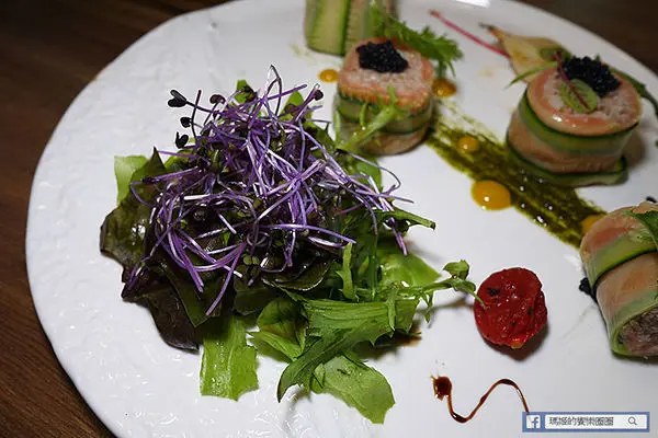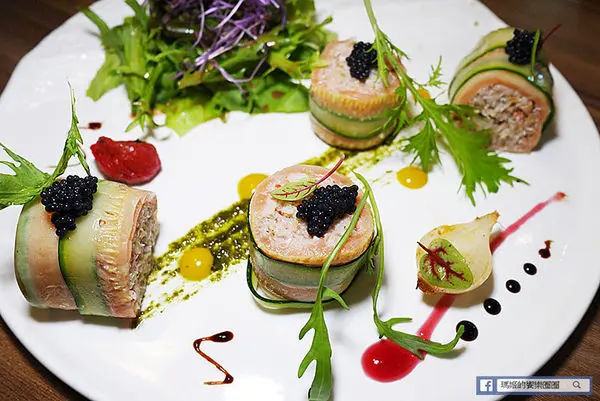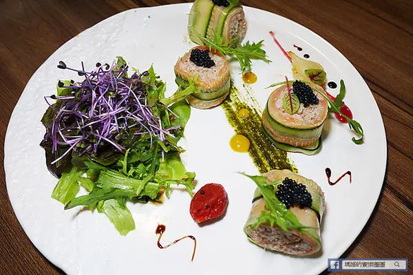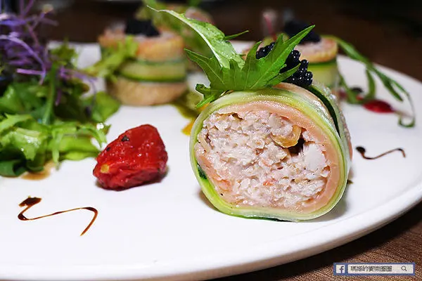 「節瓜鮭魚蟹肉捲」260元,擺盤就像座賞心悅目的小花園,讓人看了食指大動!