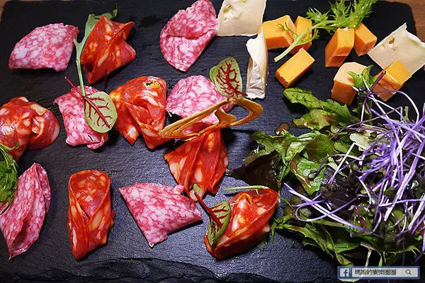 紅色是帶有辣味的西班牙腸,義大利臘腸Salami,片得薄薄的再摺像紙花般,單吃有濃郁的鹹香肉味,但不死鹹,肉質也蠻軟嫩的