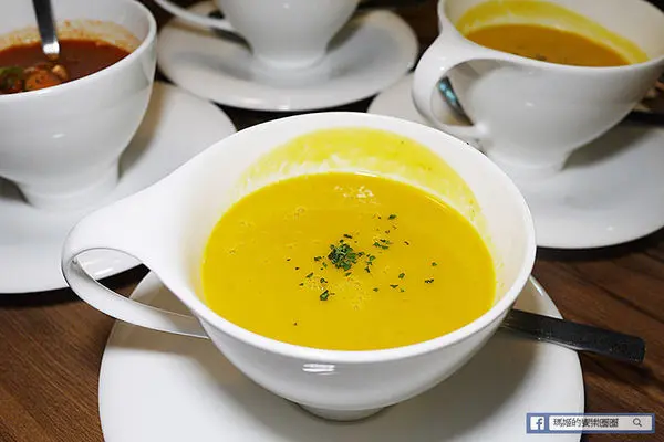 「南瓜濃湯」130元,喝得到香濃的南瓜味,還帶有細細的纖維,不是用粉泡出來的廉價南瓜湯