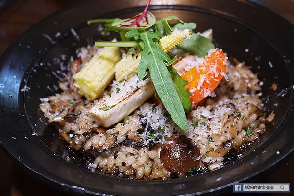 以大量的蘑菇燉煮米飯,在入味後放上烤過的甜椒、玉米荀和筊白筍等蔬菜,灑上起司提味,不僅在視覺上不會那麼單調,又能吃到營養的蔬菜