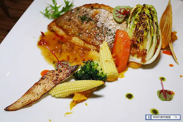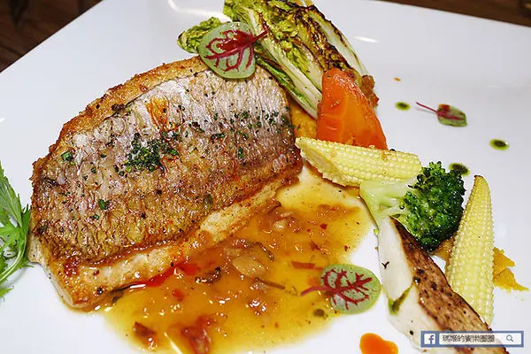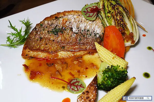 「時令鮮魚」480元,時令鮮魚都是現流的新鮮海產,今天是赤棕(學名真鯛魚),搭配烤過的時蔬擺盤有亮點