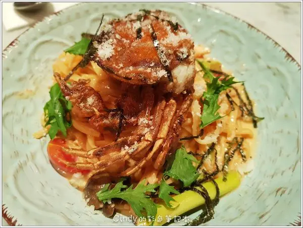 ●酥炸軟殼蟹與松葉蟹黃細扁麵 380元
