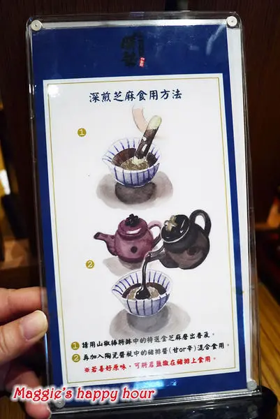 其實我的策略不是非這家豬排不吃不可,我想說若要排隊超過半小時就不等了,反正美食街裡還有其他選擇。不過因為過年大家都睡得晚,因此還不到12點來排隊,差不多等半小時就有位子了,我們等到的位子是沙發區的雙人座,感覺挺好的,室內景都是人我就不拍了。桌上立牌有教人如何食用深煎芝麻的方法。