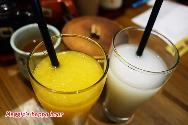 飲料我們選擇先上,一個是套餐裡搭配的,我選擇柳橙汁,另外是套餐加點的飲料,可爾必思。