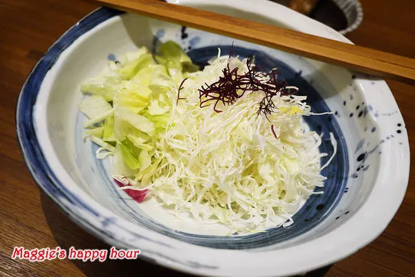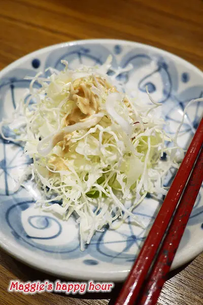 「高麗菜絲」切得很細,搭配芝麻或紫蘇沙拉醬都很對味,這可以無限續,因為好吃,我們也續了一次。
