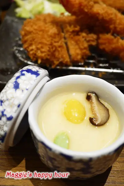 本來對鎮店招牌的人氣黑豬排很好奇,但爬過文後發現吃過的都覺得沒太大驚喜,後來就選了看起來比較豐富的「勝勢招牌」,裡面有一塊腰內肉、蔬菜捲和蝦排,加搭配茶碗蒸、甜點和飲料,套餐價360元,相對划算哩。