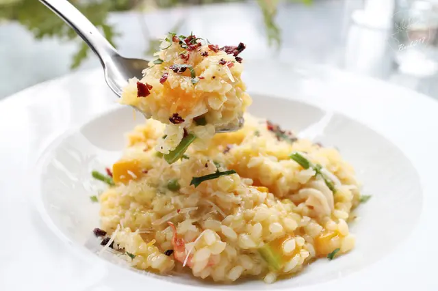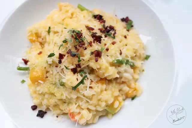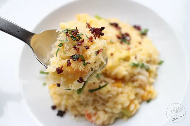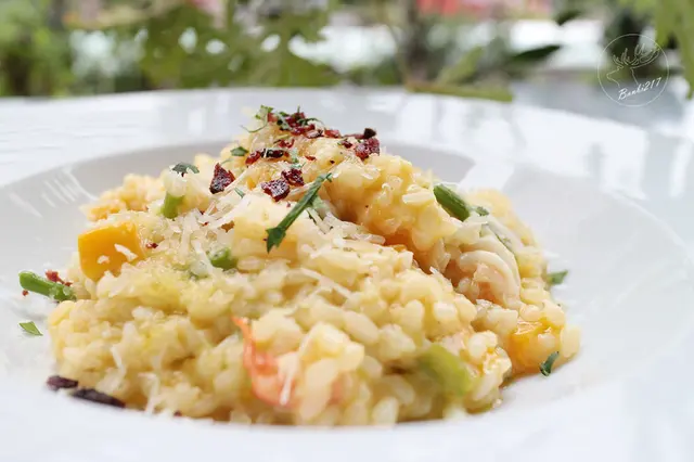 金黃色的燉飯,有淡淡的南瓜香氣,慢燉的義大利米富有口感,正是我所喜歡的燉飯類型,搭配細緻的蘆筍、蝦仁、cheese刨片、培根碎,味道清爽,重於食材原味,整體雅緻好吃。