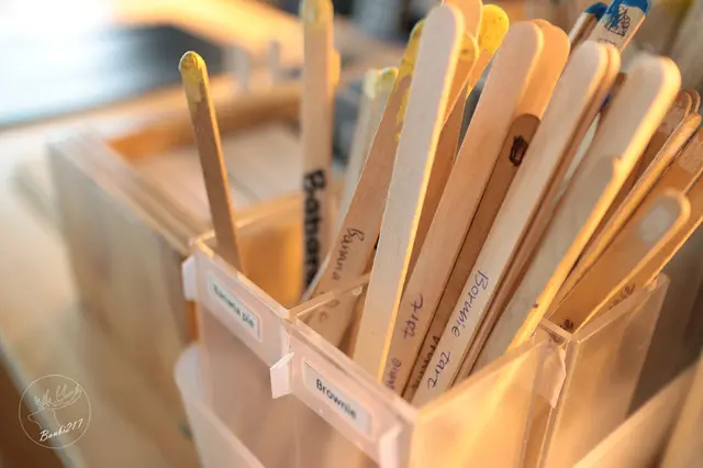 位在一樓櫃台旁的蛋糕櫃擺放著許多蛋糕與甜點,因我們的座位在二樓,於是點選好香蕉奶油派以及提拉米蘇後,店員給了兩支寫有蛋糕名稱的木棍交給我們拿給二樓的店員,二樓的店員之後會將蛋糕送餐至我們的桌位。