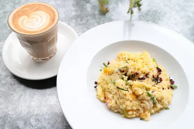 一杯好喝的咖啡,一口好吃的燉飯,清爽的午餐,感覺爽朗。