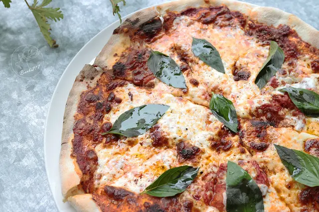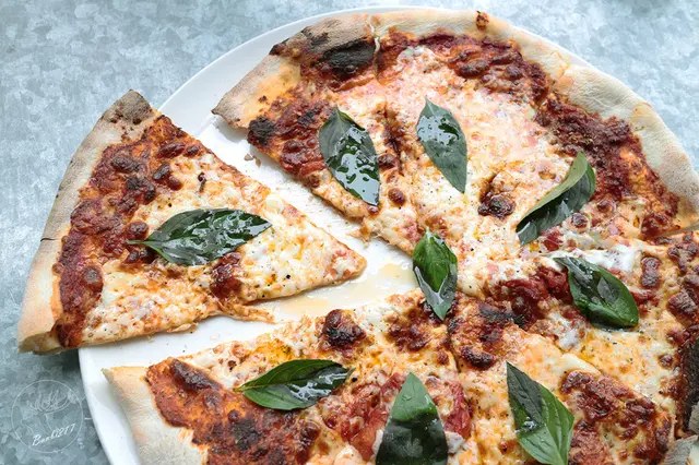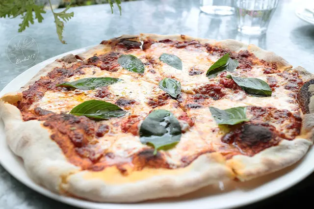 薄脆的披薩餅皮,咬下去有如餅乾那樣的聲音效果––「卡茲」。有點Q度口感的Mozzarella Cheese(馬茲瑞拉起司)、羅勒葉、番茄醬汁、橄欖油香與增添的滑順感,這份瑪格麗特披薩品嚐起來還不錯。