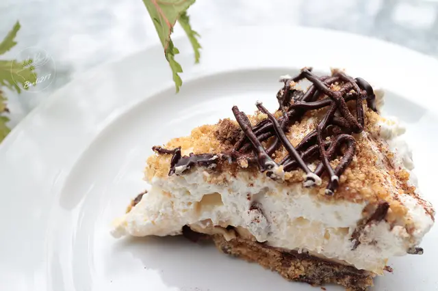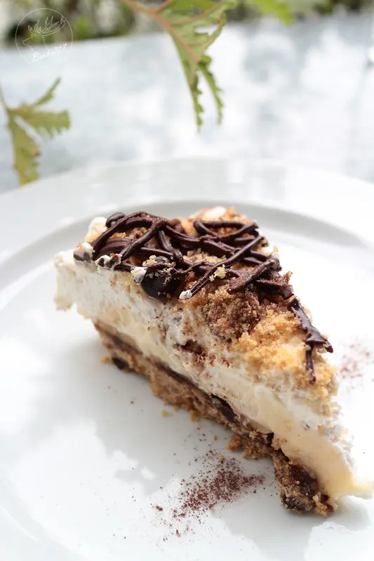 似消化餅內含巧克力塊為基底的派皮、香甜的新鮮香蕉、不膩口的卡士達與鮮奶油、巧克力粉與巧克力脆片,一層層疊上去,也讓我一口接一口的吃,口感滑順且不死甜,抓住我這香蕉愛好者的心。