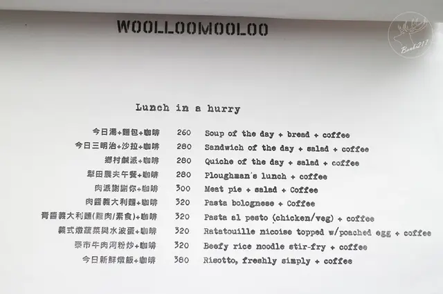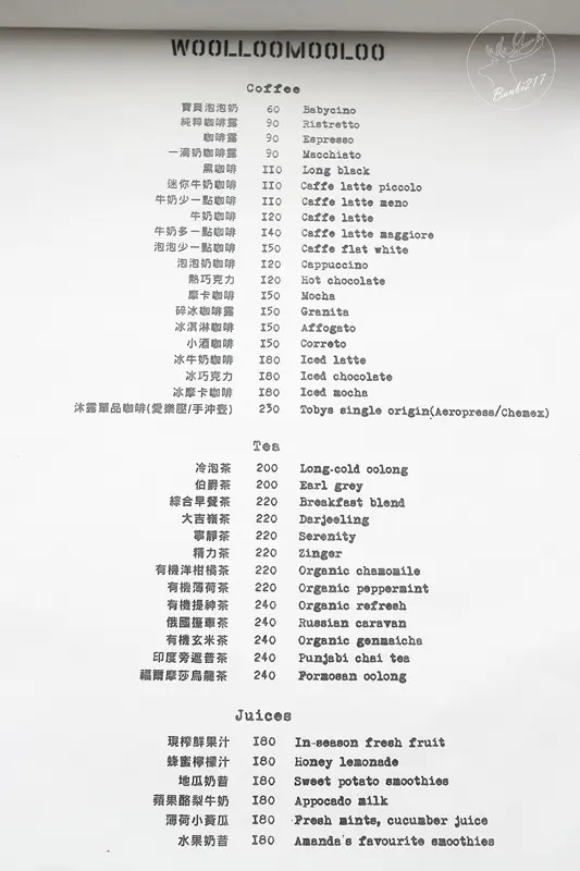 WOOLLOOMOOLOO菜單:咖啡、茶、果汁。