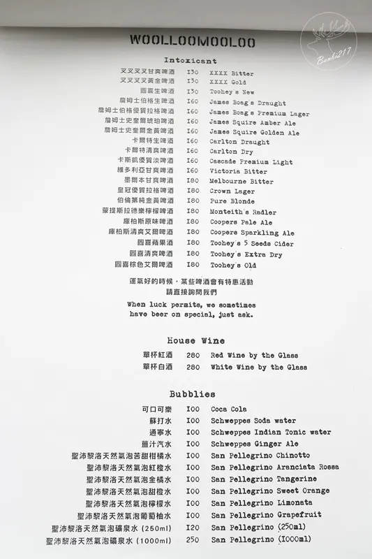 WOOLLOOMOOLOO也有供應酒類。(未成年請勿飲酒,飲酒請勿開車)