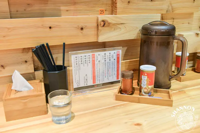 桌面上餐具、菜單、調味料、飲用水一應俱全很不錯