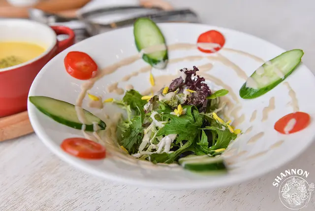 白芝麻、豆漿和白酒醋調和的沙拉醬吃起來很有特色,不過不太適合我的口味所以交給S解決!