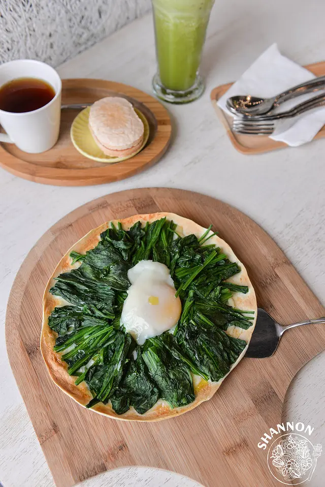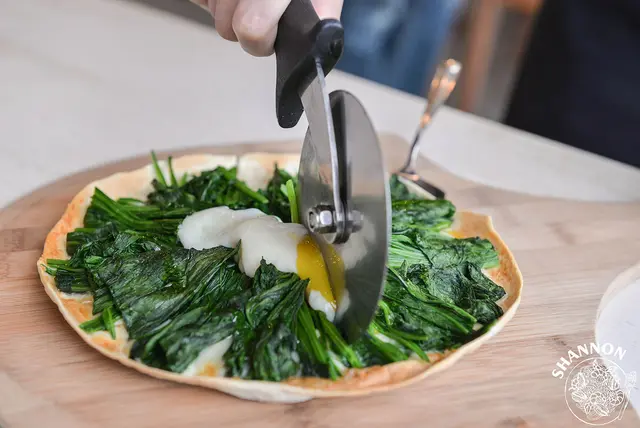 拍完照店家隨即幫我們切片,口口吃起來皮脆菠菜也保有本身口感,帶著蛋黃的香氣非常順口,是我也會推薦點用!