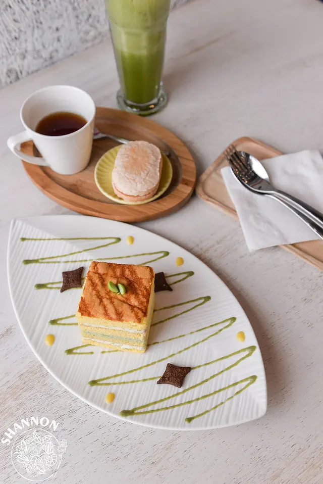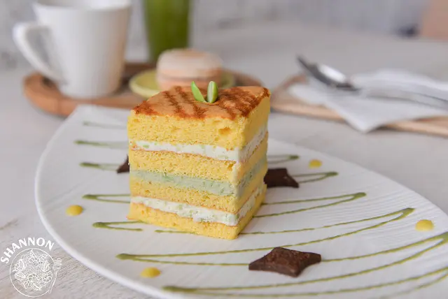 蜂蜜海綿蛋糕搭配抹茶鮮奶油,口感蠻扎實的可能退冰還不夠鮮奶油有些冰、硬可惜了點,甜度還蠻能接受吃得出淡淡的抹茶香氣只是吃好飽就沒有解決掉了!