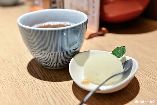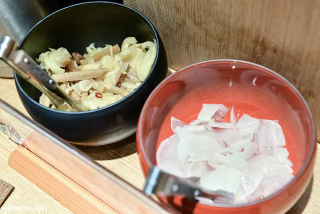 旁邊還有可以搭配的漬物隨意享用,醃蘿蔔酸酸的口感脆脆的還不錯吃,一旁的嫩薑醃牛蒡我自己是不愛但S覺得微微的辣、酸挺清爽的!