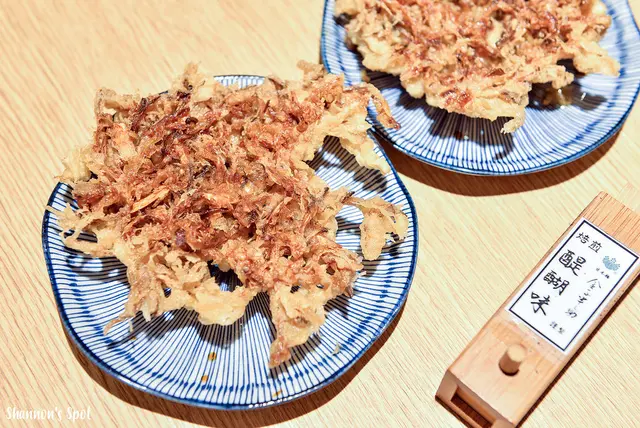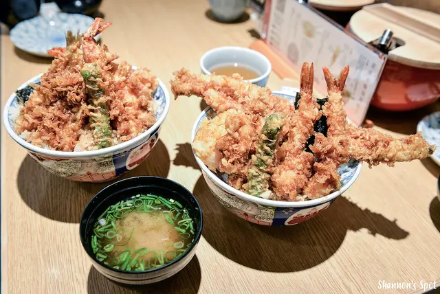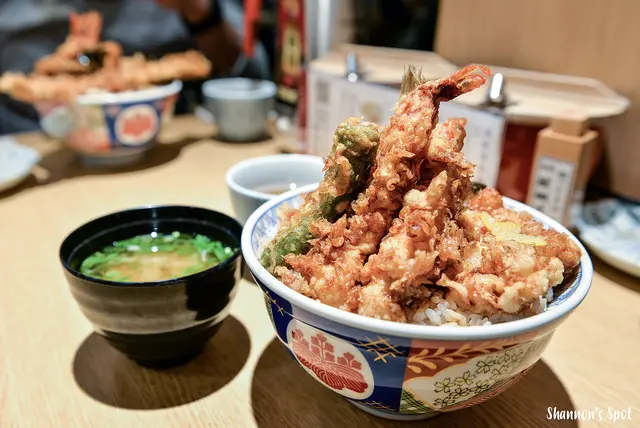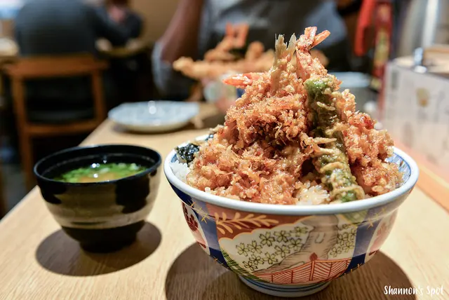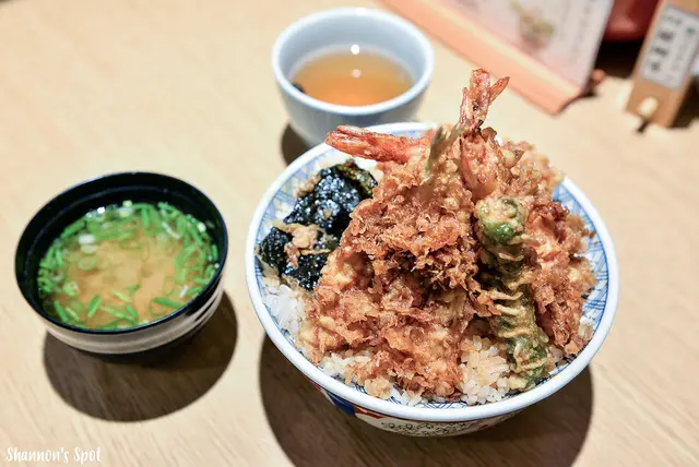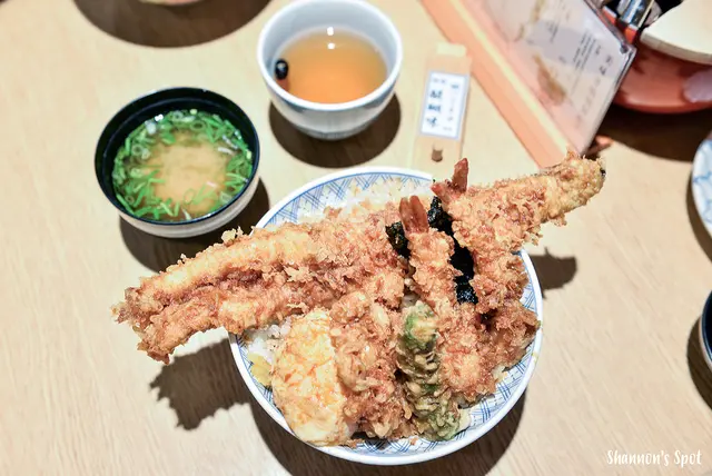 味噌湯的整體香氣和口味都還好所以印象不深,這天丼內容有鱚魚、大蝦、干貝、魷魚、青龍、炸半熟玉子、炸海苔片