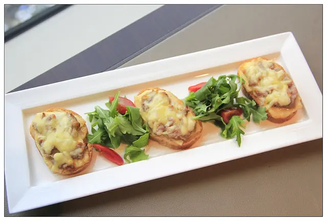 這道沙拉前菜有點像小PIZZA的感覺~