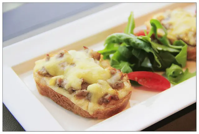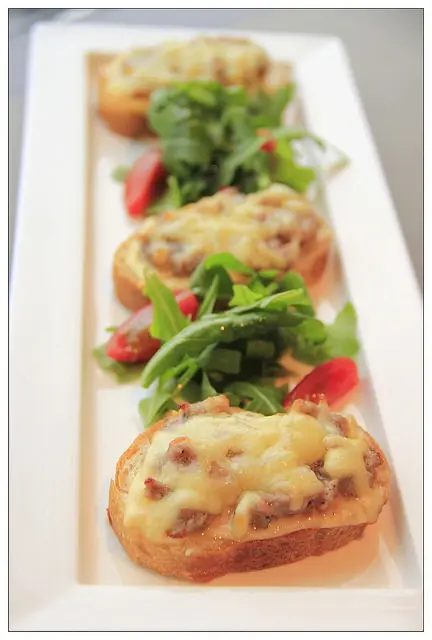 底下是脆口的小麵包~上方則是以帶有煙燻味的義大利香腸搭配濃郁起司