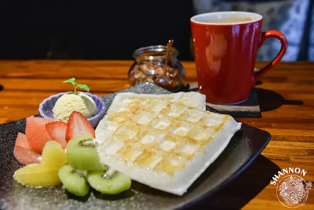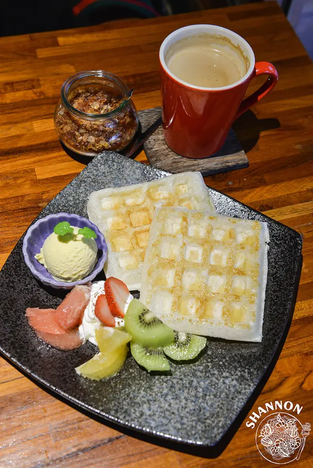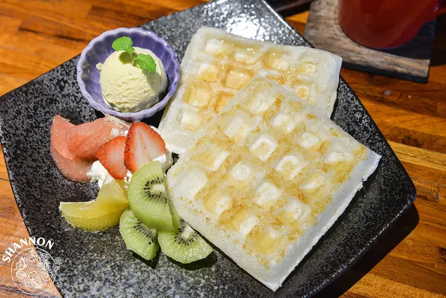 點用的時候店家有說明白格子是麻糬的鬆餅,所以吃起來會有些彈性!一旁搭配一些新鮮水果和冰淇淋我都沒有品嘗,不過朋友表示OK