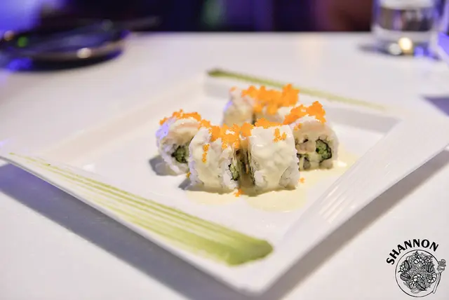 上方有擺放生干貝搭配著蒜味美奶滋在灑上蝦卵裡頭包著炸蝦、小黃瓜絲,簡單來講我喜歡這大蒜美奶滋醬料的味道,酸酸的帶些蒜辣感覺非常開胃,上方的干貝嫩口整體還OK!
