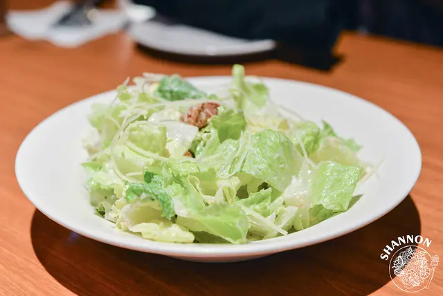 點完餐點其中一個配菜選擇凱薩沙拉,大魚大肉就來點生菜!凱薩味道很剛好且分量算多還蠻不錯的!