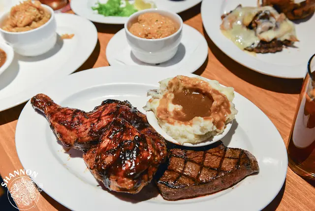 套餐搭配兩個配餐是選擇香料飯和馬鈴薯泥搭配牛肉醬汁(這搭配好吃阿),整個超級豐盛的啦!本來很怕烤半雞會很老柴結果很嫩口呢,而且味道我也覺得挺香的好吃又挺大隻,火烤德州牛排五分熟度口感比我們上次的火烤德州牛排8OZ(搭配冠軍豬肋排 1060元)的口感好咀嚼多了,可說是也嫩口蠻好吃的呢!不知道是不是因為上次的比較厚所以不方便咀嚼?但總之我覺得除了牛肉好吃外半雞也是很不錯的選擇!